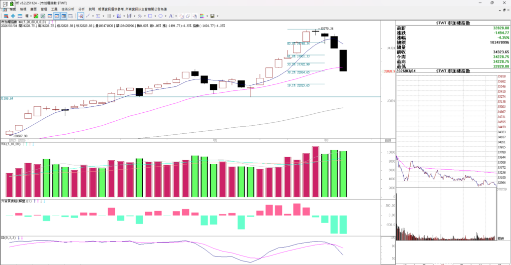1.台股大盤走勢 大家早安,台股昨天大跌 1500點跌4..35%,跌到月線的位置,昨天盤中有出現拉抬 在九點半的時候,但是買盤不繼指數又被打下去。昨天外資賣超964億、前天賣超947億、兩天時間大賣將近兩千億,台股是被外資賣下來的。不只台股下跌,韓股和日股也大跌。韓國跌的比台灣慘,韓股第一天跌7%...