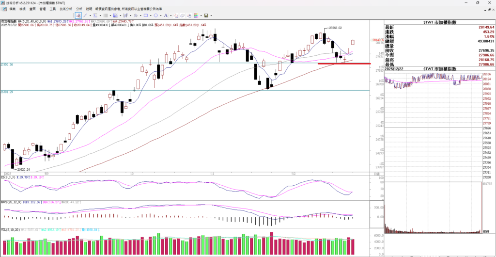 1.台股大盤走勢 大家早安,台股本周已經上漲675點,大盤已經漲到 28371, 前高28568,看何時能創新高。若能帶量突破前高區,才有機會延續短線多方走勢。。國際盤勢方面,聖誕老人行情(Santa Claus Rally)啟動 科技動態: 市場傳出英偉達(NVIDIA)暫停測試英特爾(Intel...