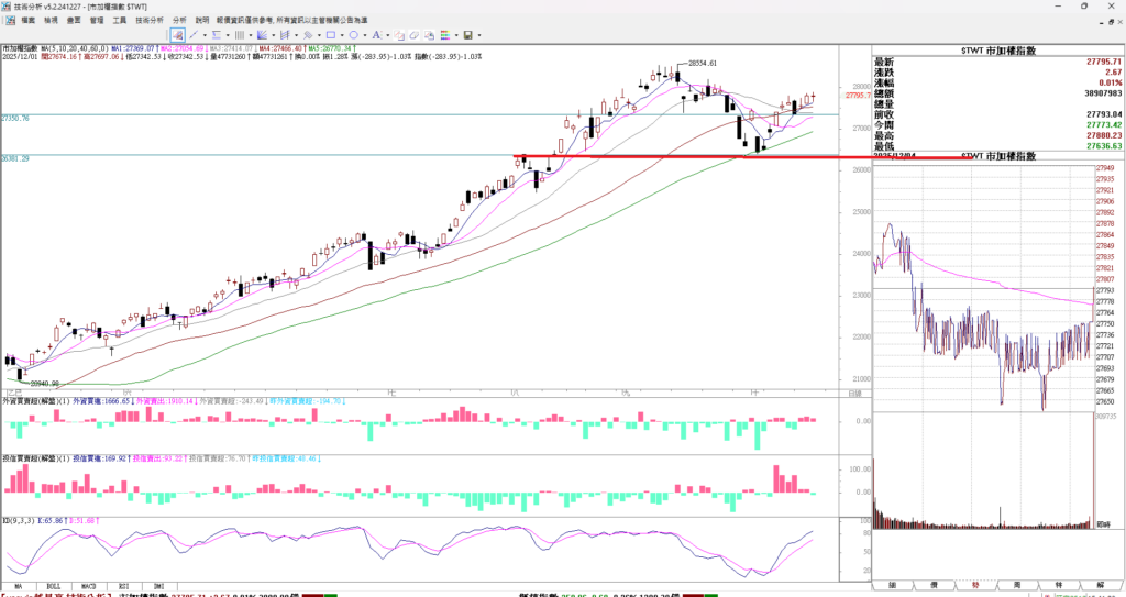 這四種都是有可能,這也是交易比較難的地方。到底是會直接上去,還是大箱型整理,或者現在已經進入高點再漲有限 ? 我們先以時間來討論,過去十二月和一月是傳統的上漲月份,年底+過年前上漲機會高。 接著以總經來思考,AI無疑是現在股市上漲的最大核心動力,AI是否泡沫,或是AI發展持續中是未來行情會不會上漲的重點。以AI的應用來看,應用在工業生產、機器人、自動駕駛、國防、醫療、教育,各行各業都可以應用AI,AI不是只有CHATGPT 的聊天機器人 這個範圍而已,而是它可以廣泛應用在日常生活周遭。所以我覺得,還有很大的成長空間。