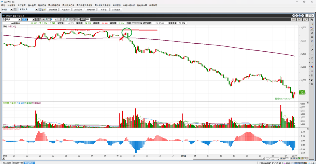 看台指期五分K,昨天夜盤一路往下 毫無阻擋。下圖畫了一個紅色橫線,那是盤整區的高點 是壓力所在,綠色圈圈是昨日反彈的高點,漲到壓力不過 是轉弱點,是多單出場點,是空單進場點。一轉眼就跌兩千點。