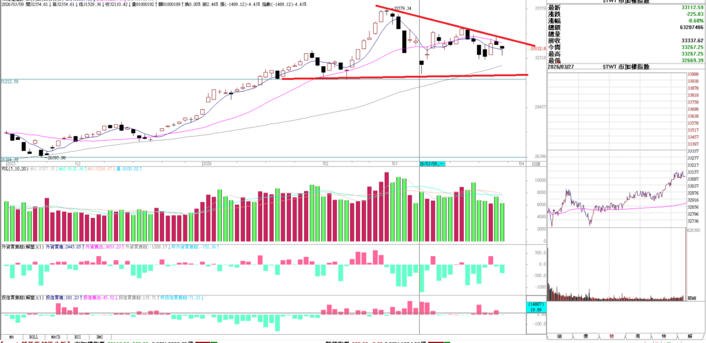 大家早安,上台股上周五小跌 0.68% ,但是夜盤大跌 880點,看來周一開盤要跳水了。只是過去跳水 都有資金進場拉抬。看這次會不會。 最近行情每日平均波動都有一千兩百點 (包含日盤和夜盤價差) ,所以跌個千點不要慌、漲個千點不要貪,就是在區間裡面震盪。 最近波動很大,但還是盤整盤,大家要習慣。目前大盤三角整理等突破。