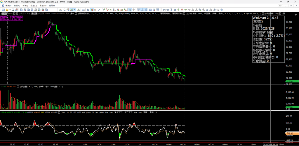 看台指期五分K,週五下午三點過後 就是開低走低往下走的盤,以開盤定多空來看,跌破就是轉弱,接著多空電話線也是綠色電話線往下跌。