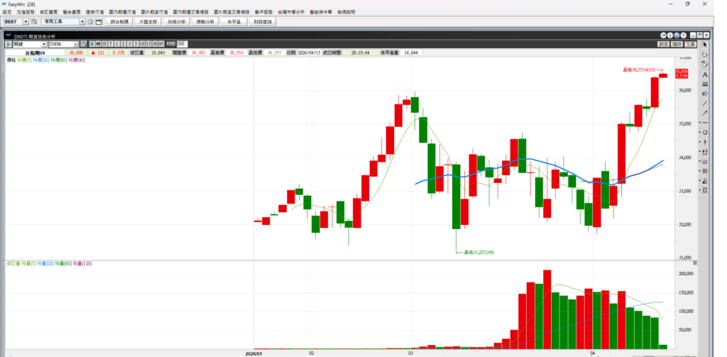 大家早,昨天台股大漲,期貨上漲 921點,加權指數上漲838點 上漲2.37%,期貨明顯正價差 漲幅比現貨大。昨日拉長紅突破前高,將近千點的漲幅,是非常強勁的多方表態。大盤漲到 36296,成交量放大到 九千七百多億。成交量這麼大 券商獲利增加股票可以買。