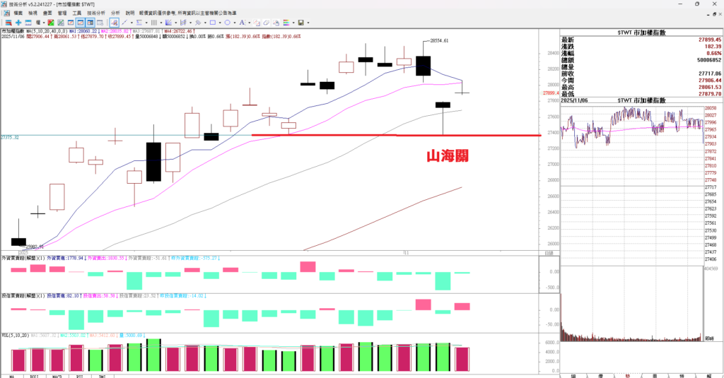 大家早安,台股昨天上漲 182點 但是收墓碑,價格漲到上方均線有賣壓,前天開低拉T,昨天開高收墓碑,上下都有力量在制衡,先看區間盤整。指數昨天漲到 27899 。目前台股政府作多心態明顯,就看外資會不會繼續賣超了。最近比特幣也大跌,股市也大跌,大賣空的主角開始放空輝達股票,AI股票估值是否過高 是最近股市修正的根本原因。