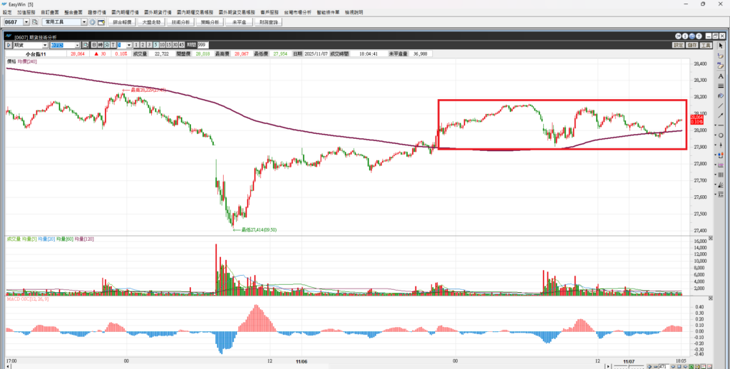 台指期5分K,低點反彈後整理,希望繼續盤整偏多上漲。