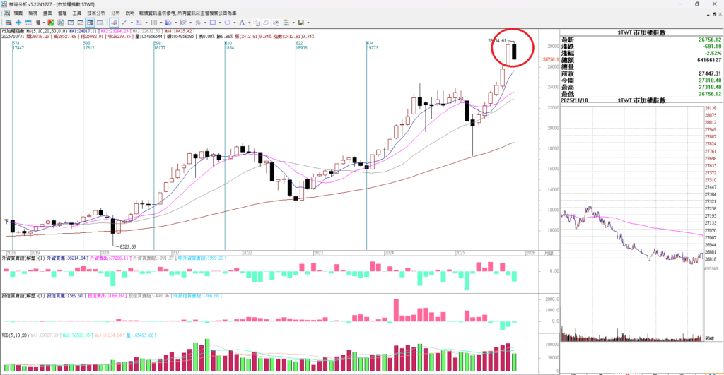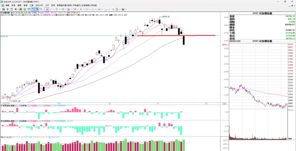 大家早安,台股昨天大跌 691點 跌到26756,11月到目前為止已經跌了1477點,將近1500的跌幅,10月台股大漲2412,已經跌回62%了,若整根長紅被吃掉,就是高檔長紅並列,走勢反轉,不得不謹慎。 好在我們已經多天在交易日記內提出警示訊息,要對行情回檔要有準備,所以提前有準備的朋友都比較能從容應對。事先想好交易計畫 以免手忙腳亂。