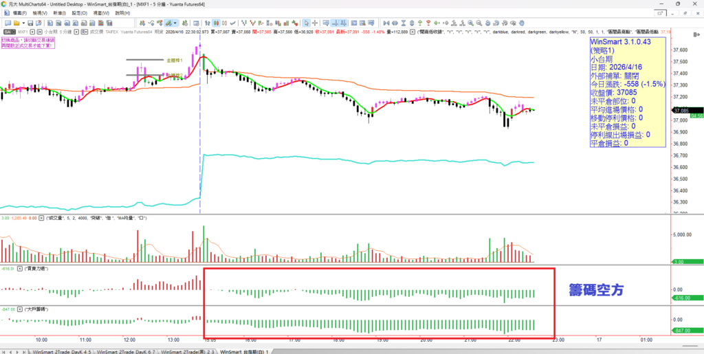 看台指期五分K + 多空電話線(橘色線) + 期貨籌碼 ,可以看到 K棒在 橘色主力成本線之下,行情偏空,且籌碼是綠色柱狀體代表是賣壓大,行情容易跌。連續漲了八天 終於有比較大的拉回。