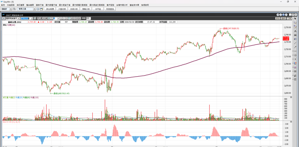 大家早安,今天是馬年開市第一天,先跟大家說聲新年快樂,馬上獲利。希望一開盤就獲利。過年前四天台股上漲 2600點 這是很大的漲幅,才短短四個交易日,特別是第一天,先大跌六百多點再大漲八百多點,一天就有一千五百點的震盪幅度。是很大的漲幅,然後每天六百點的向上拉抬。這不是牛,這是脫韁的野馬。馬年的行情就像是脫韁的野馬往上奔馳。川普也說了,美股要漲到十萬點,所以他會在政策上做多。那麼台股也將會是受惠者。台股過年之前遇到的狀況是那斯達克大幅拉回後的緩步向上。如下圖那斯達克日K ,和小道瓊創新高後的拉回震盪。道瓊走勢明顯比那斯達克強勁,那斯達克走勢偏弱,顯現市場對科技股有些疑慮,特別是漲多的AI股。