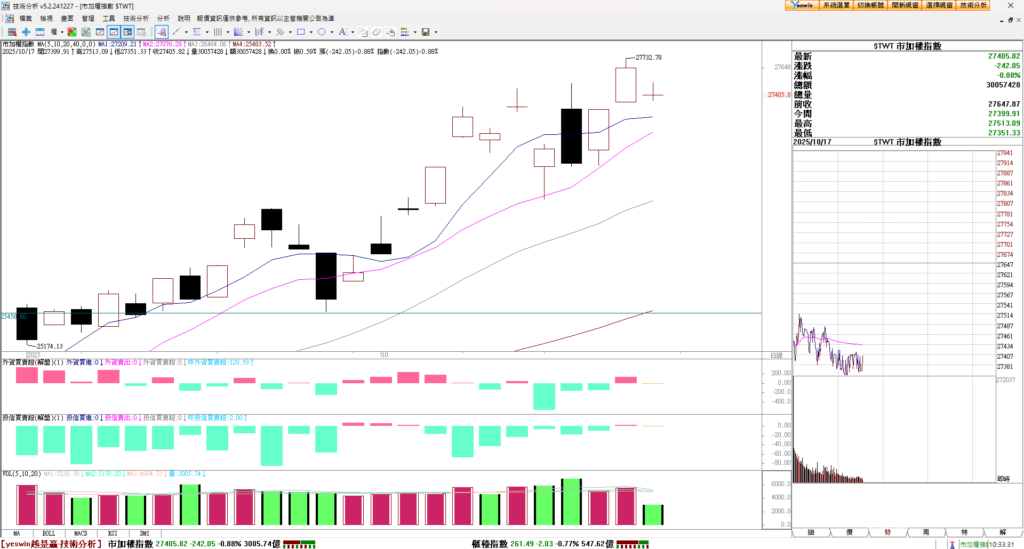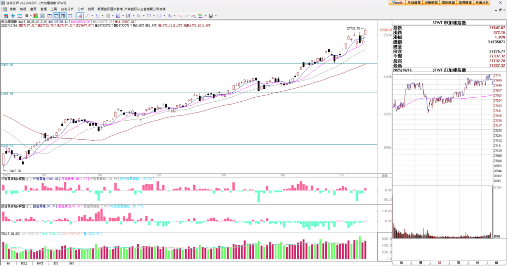 大家早安,台股昨天大漲 372點,漲到27647 創新高,台股強勢上漲,昨天外資買超117億,自營買超53億、投信買超64億,合計買超235億讓是台股大漲。最近台股都以為會拉回 但是完全不拉回,10/13日以為會下跌一千七八百點,結果只開低七百多 最後下跌378,10/14開高走低溜滑梯跌 700點,以為隔天也會拉回,結果隔天不但不拉回 還大漲482點,接著上漲372點,兩天大漲 854點,大跌過後將近一千點的漲幅做回應,這就是最新台股走勢。