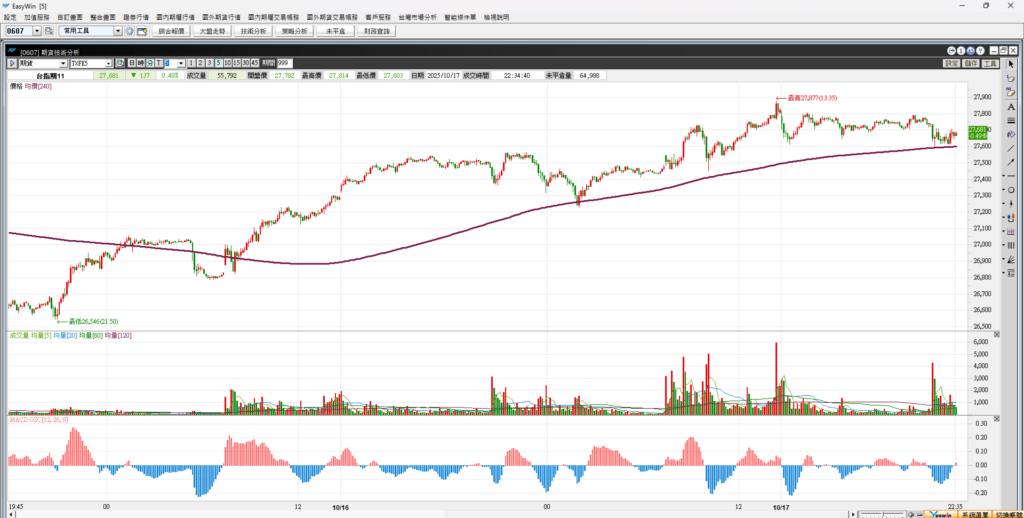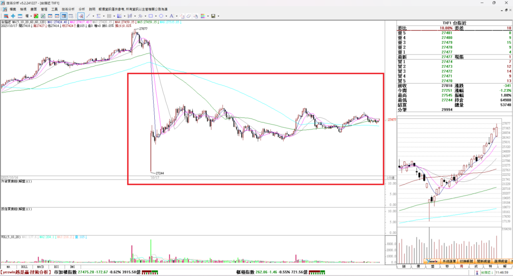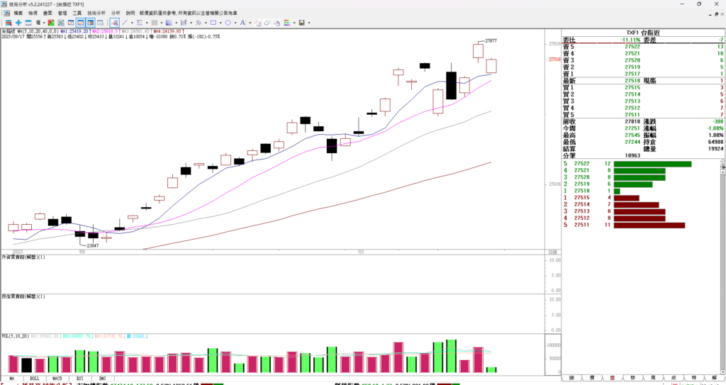 看台指期五分K,雖然是小幅度的拉回 但是就有一百七十點的跌幅,表示行情高檔 波動自然放大。27000點的1% 是 270點。所以台股很容易有三百點的震盪幅度。請大家操作小心點。