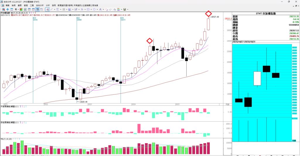 大家早安,上週台股上漲700點,十月台股上漲 2412點,股市頻頻創新高。現在正在走大多頭。真沒想到,川普的關稅大戰之後股市大多頭。台股已經漲到兩萬八千兩百多點,照著速度很快到兩萬九。但是請投資人小心,漲越多、漲越快,請越小心。因為角度太陡的走勢通常不會持久,也通常是末升段 或是末跌段。 現在台股走勢有一點陡峭,特別是看月K。我們看一下台股月K走勢,在2024年的六月 是最大一根長紅K (紅色方塊處),當月漲勢最凶猛,接下來就進入大區間盤整 + 崩盤。 今年的十月也是最近的最大長紅K (紅色方塊處),有點噴出強漲接近盡頭的味道,這點請投資人小心。意思並不是說會馬上走空,而是走勢無法持續高速的大漲 (和高速的大跌),一定會需要經過轉換、休息再上、或接走勢反轉。 以經驗來看 這裡交易請小心,可做多 但降低部位。