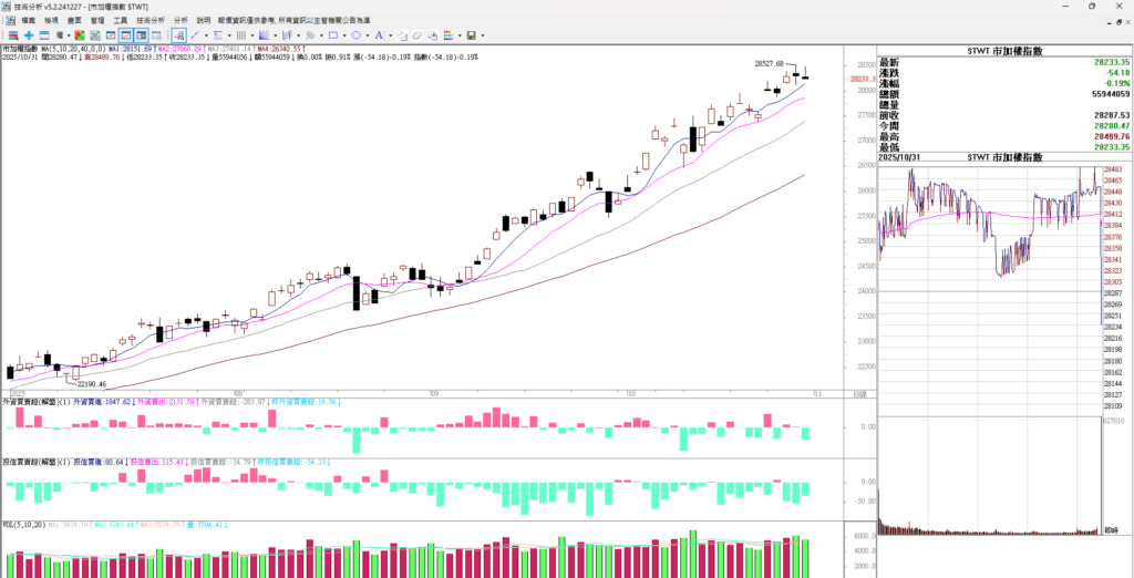 由於十月份漲太多,當月份上漲兩千四百多點,所以漲多拉回很正常。接下來一個月 先保守小心應對。