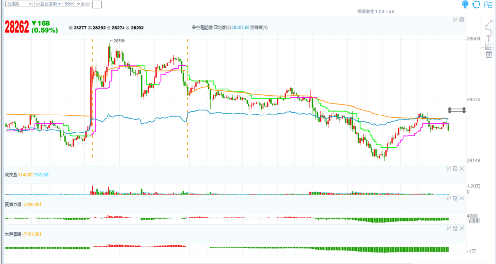 看台指期五分K,週五震盪上漲,但週五晚上就直落下跌,終場下跌 168點,走勢走弱。