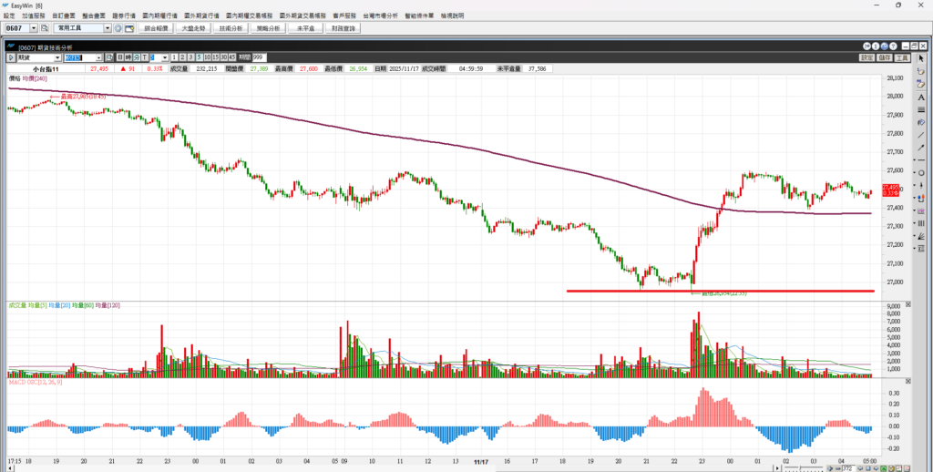 看台指期五分K,週五晚上本來大跌三百六持多點,但是美股開盤後就反轉,一路往上拉,讓台指期夜盤呈現一個很大的T字棒,高低差有四五百點的價差。本來危險的走勢經過禮拜五晚上的V轉走勢,變成有個隱形的支撐在那。
