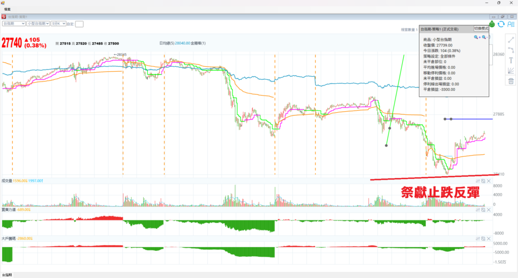 看台指期五分K + 多空電話線,昨天開低走低跌到低點就開始反彈,這個位置是日K的季線位置,季線目前上揚,這是今年第二次回測季線,通常長期的均線不會這麼快跌破,所以這裡反彈 是多方好現象。繼續觀察。