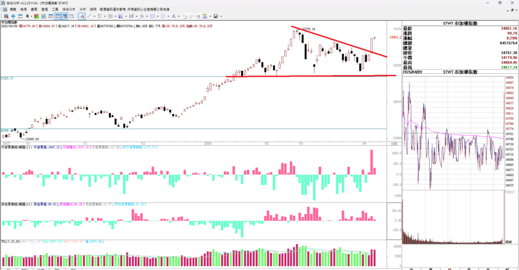大盤已構築扎實的「W底」型態,並站穩所有均線。短線多頭格局延續,下一個挑戰目標為 35,000 點及歷史高點 35,579 點。