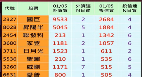 昨天外資投信 同買的股票 有國巨、聯發科、家登、日月光、聖輝、威剛和愛普