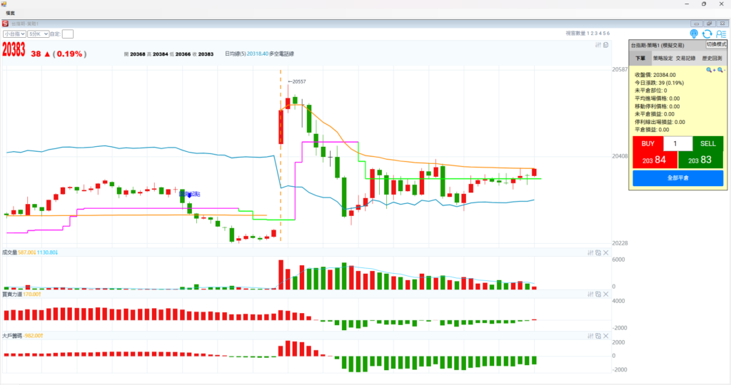 台指期五分K,昨天開低走高,但是期貨夜盤又下跌,所以現在就是漲多以後區間整理,等台股上下震盪出一個新的整理區間。