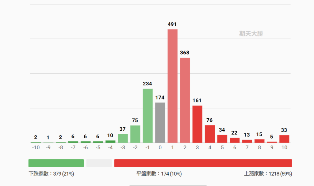 上漲家數 1218 家 (69%),下跌家數 379 (21%) ,上漲家數比較多