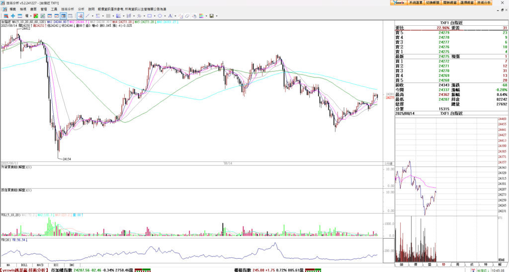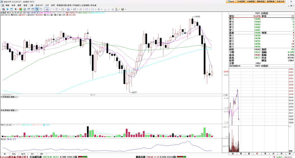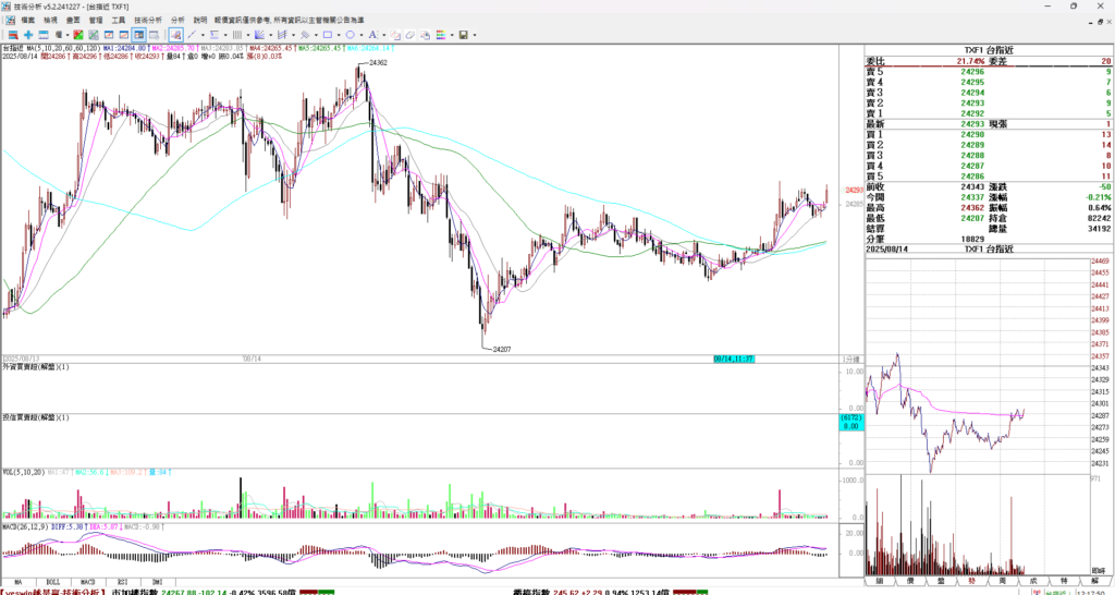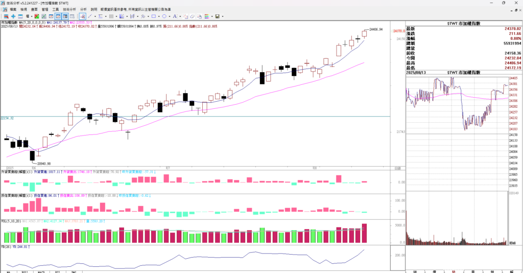 大家早安,台股昨天又上漲 211點,漲到24370。台股持續創新高、台積電也持續創新高,昨天帶領台股上障的權值股還有台光電、台達電、奇鋐、臻鼎-KY、智邦等股票。台股技術線圖正在走多。
