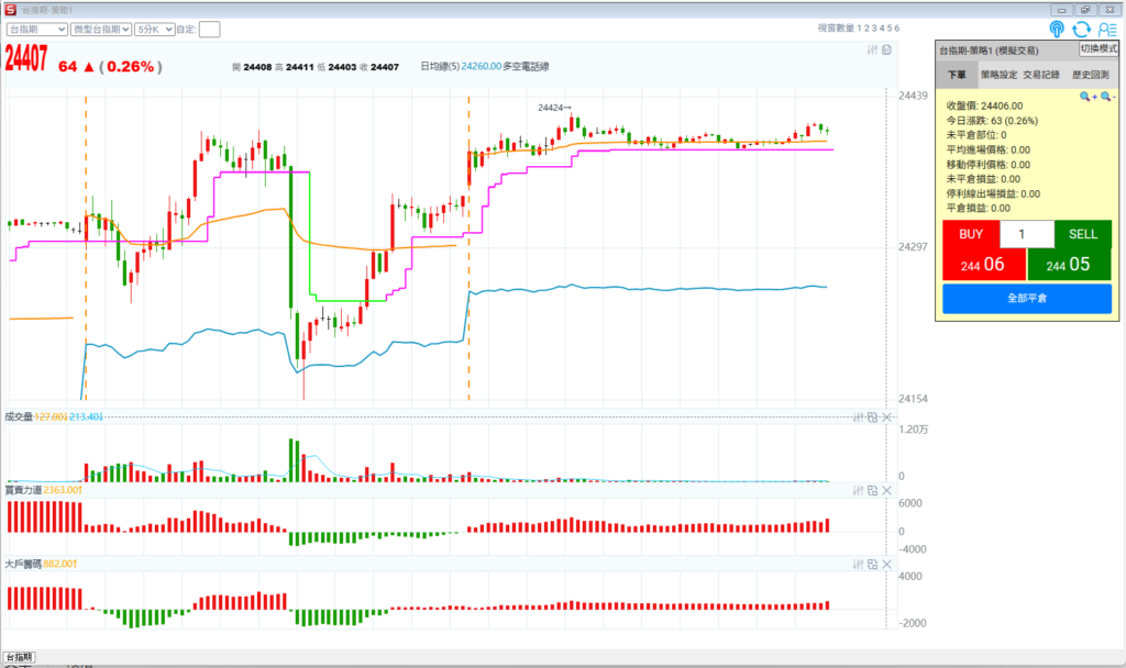 看台指期五分鐘K棒,指數往上漲 64點,白天一度下殺兩百點,這是很機車的走勢,十分鐘跌完,然後就右上拉。昨天這一段急跌 比較難掌握,除非你用大單監控,看台積電大單賣出。