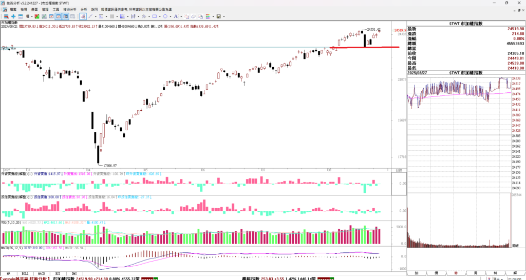 大家早安,台股昨天上漲 214點,台指期上漲 208點,台股漲到 24519 ,台股幾乎創新高。昨天很多股票上漲,漲停股票有 45檔,宏達電、漢翔、雷虎、精誠科、楠梓電、波若威、南電、台耀等股票漲停,走勢很強。輝達明天公布財報,台股算是提前上漲。永傭金首席經濟學家預估台股會漲到 26000點,還會上漲 1500點,很好的預估。但他也說,如果下跌會下跌兩千點。多空都說了一遍。