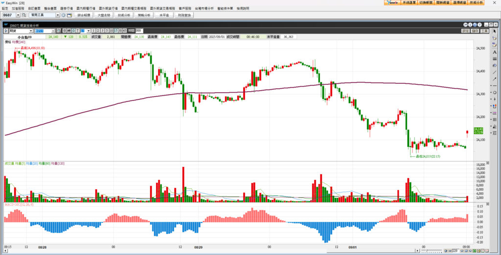 大家早安,台股上周五連續兩天收黑,高檔收黑 雙鴨躍空,走勢容易回檔,而台指期在周五晚上又下跌 204點 ,跌到 24064 。而周選SP最大未平倉量剛好就在 24000 ,所以周一開盤往下開低以後,是否再破24000 就是很重要的觀察指標。兩萬四整數關卡是本周觀察重點。