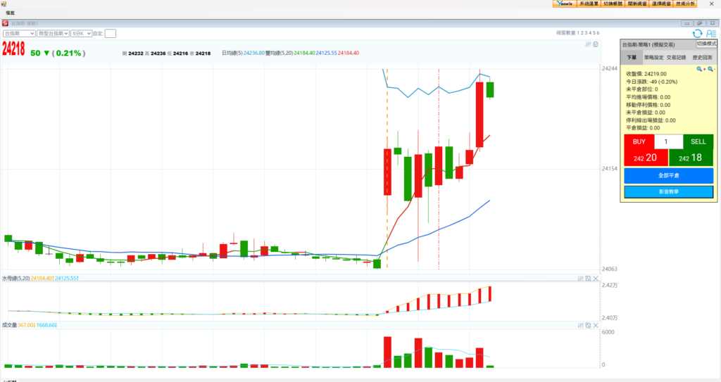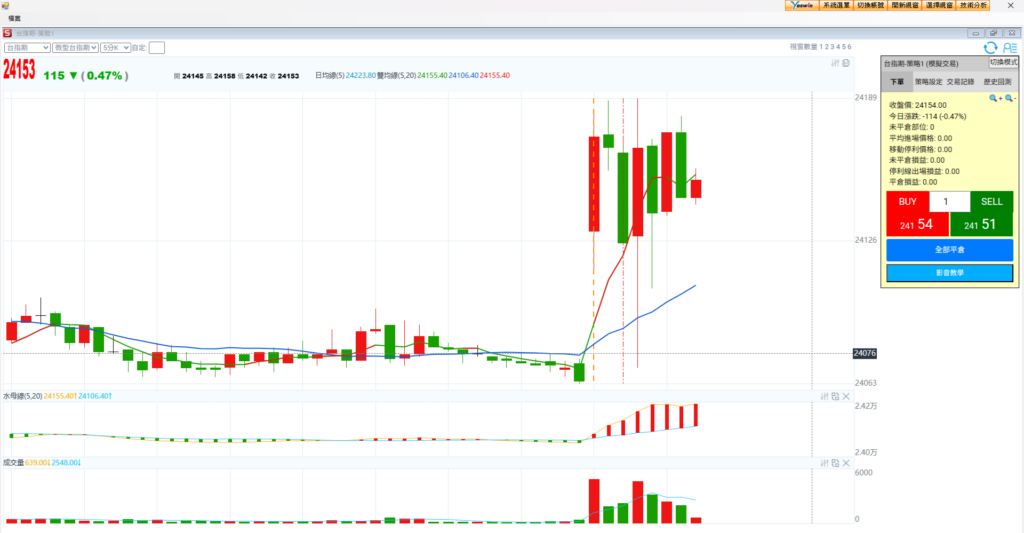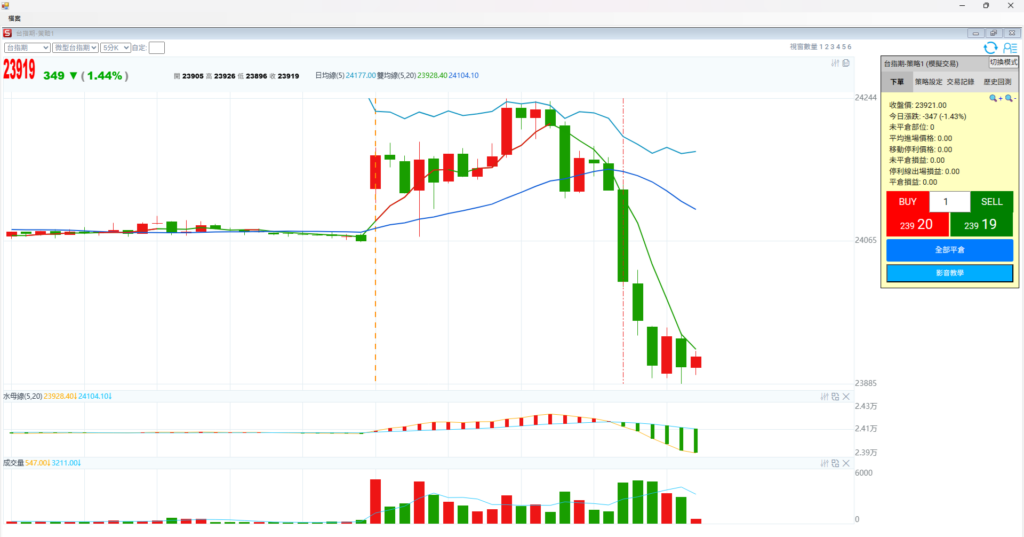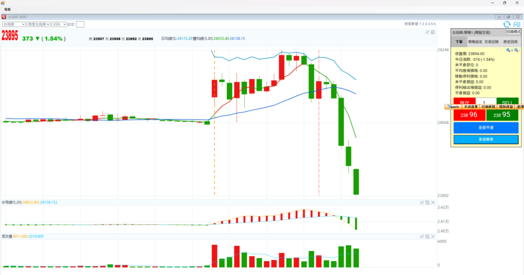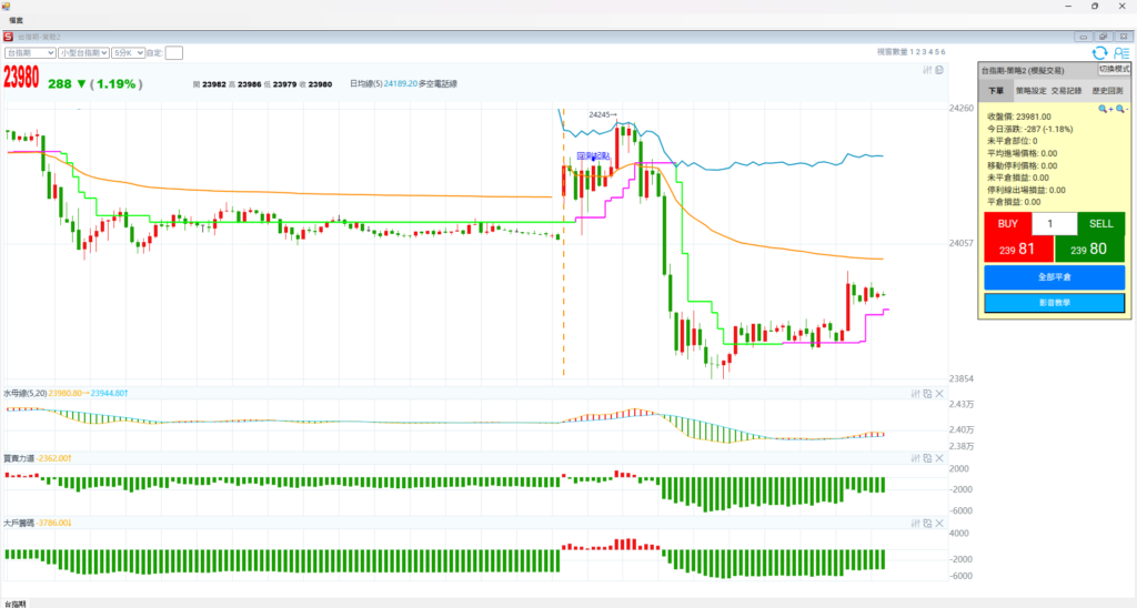 台指期五分K ,綠色電話線往下,震盪往下,上週五一路往下跌,走勢高低差有五百點。跌幅算大。所以本周還有些下跌的壓力。