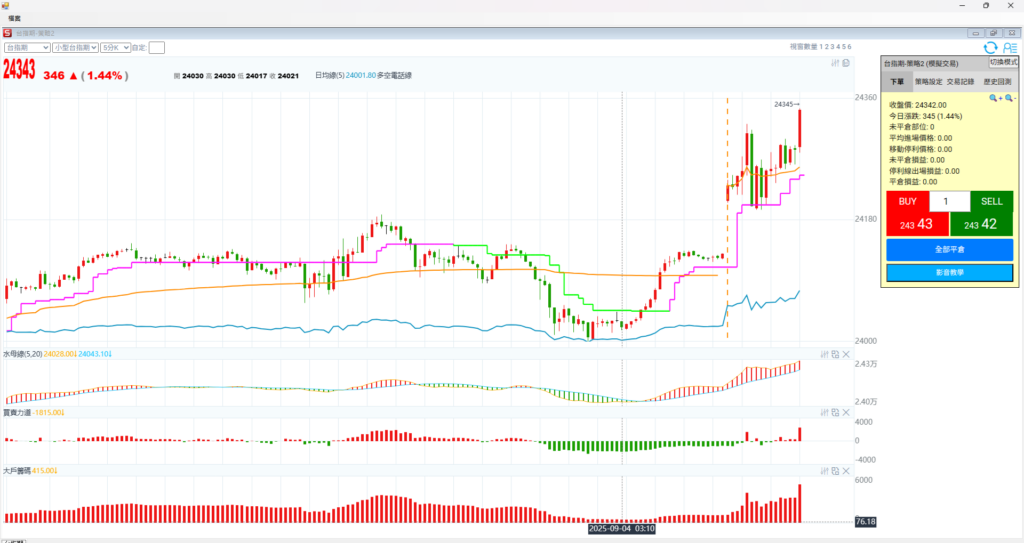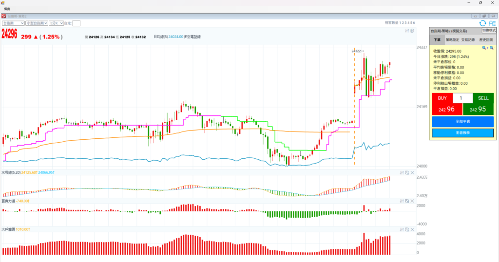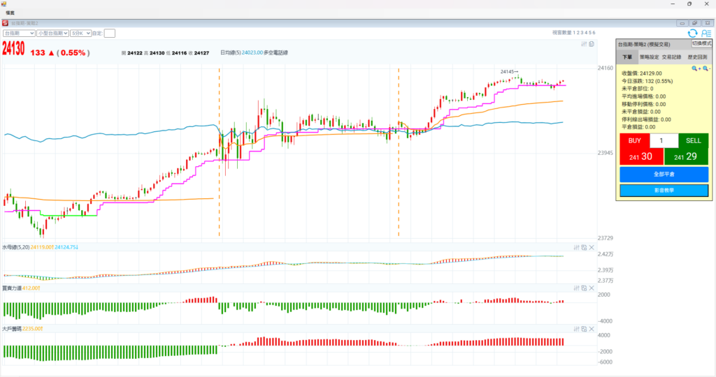 看台指期五分K + 多空電話線,紫色電話線往上代表行情向上。前天夜盤台指本來大跌兩百多點,昨天台指震盪向上走,晚上又繼續往上漲122點,真的一路北上,看這台指期走勢 + 紫色電話線往上就知道。