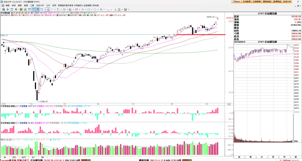 大家早安,台股走勢昨天大漲400點漲到 25200 ,昨天外資大買超476億,外資已經連續買超7個交易日,累積買超1539億,台股創新高外資居功厥偉,昨天台幣也是上漲 ,這幾天台幣從從30.757 兌換一美元漲到30.325兌換一美元,表示熱錢流入 股市上漲,再加上外資期貨空單下降,連續兩個月下降,現在已經降到1萬7813口期貨空單了,這表示台股就是外資大作多,讓台股上漲。自營在這段時間也是做多。