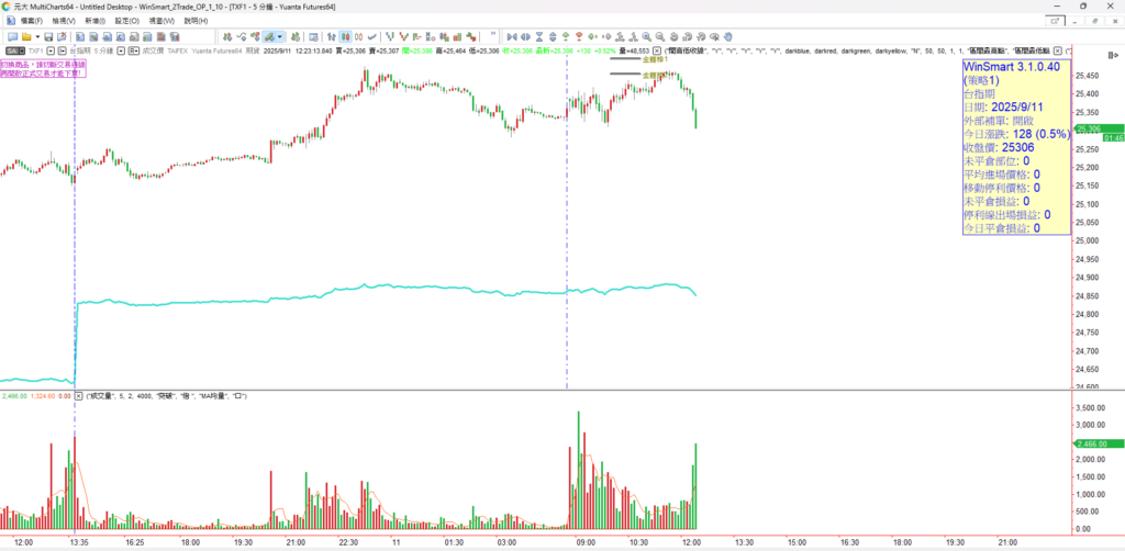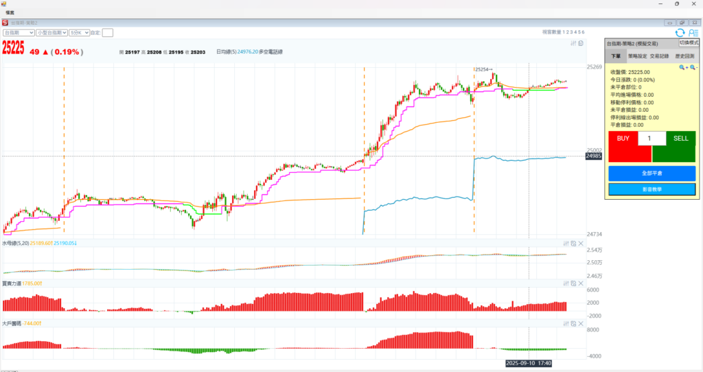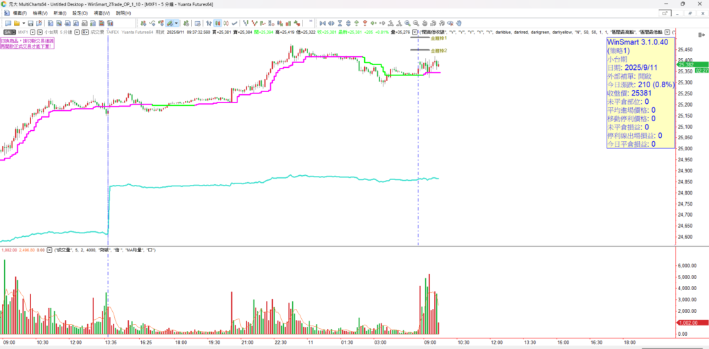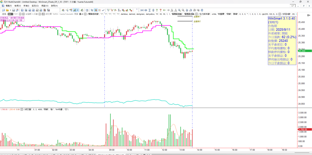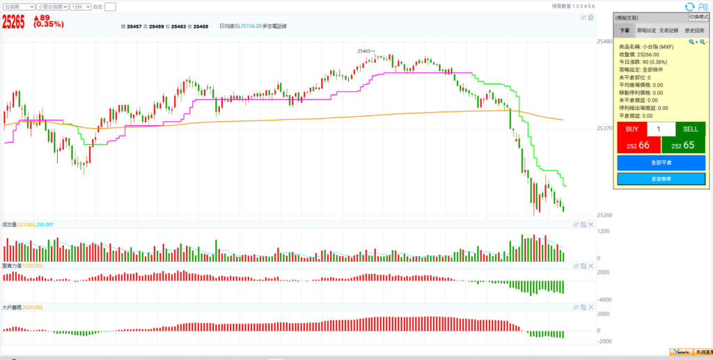 看台指期五分K + WINSMART多空電話線,紫色電話線一路往上大漲四百點,這就是最近的走勢。只要行情走強順勢交易就可以了。
