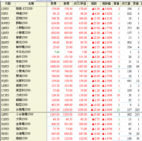 股票期貨上漲的有 4958臻鼎、神達、亞翔、群聯、華碩、東元、華邦電、為升、華碩、東元、中石化、奇鋐、雙鴻、光寶科、健鼎、南亞科、力成等股票 ,參考一下,股票上漲名單可以從裡面找