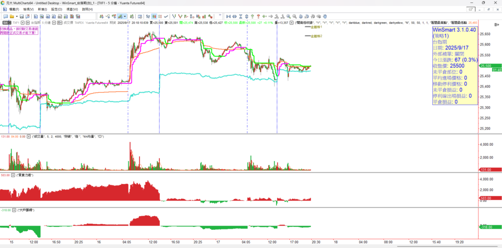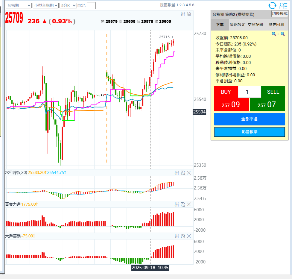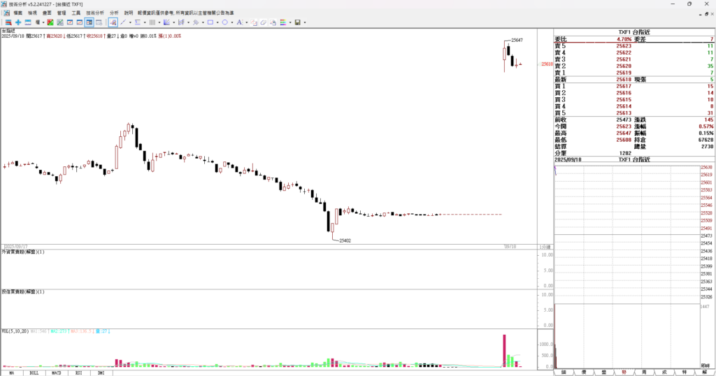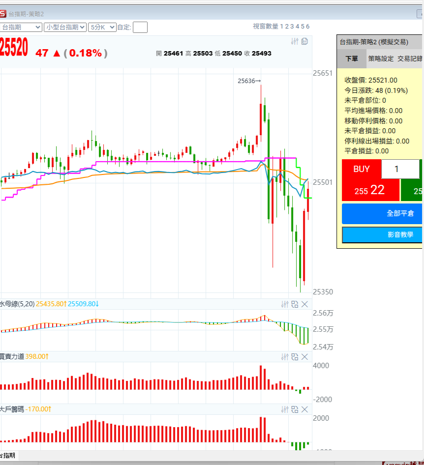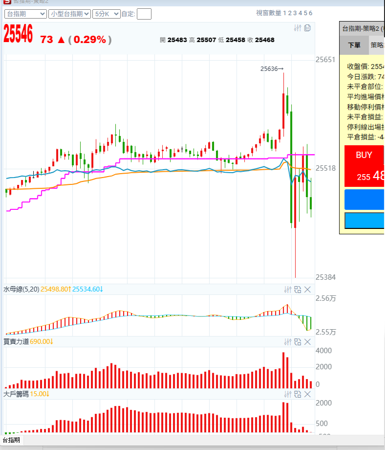 看台指期五分K,昨天進入拉回整理。創新高後拉回,而且價格接近五日均,這是關鍵位置,如果跌破五日均就轉弱,五日均有撐往上又是個反彈買點,現在在十字路口。