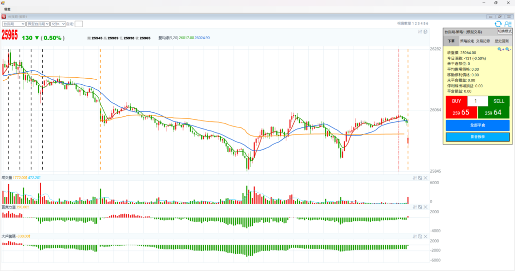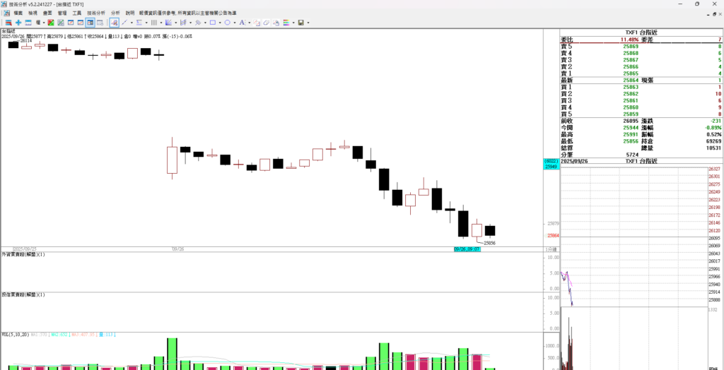 台指期五分K,台指期昨日從白天到晚上,都出現雙均線往下走 空頭排列。 走勢偏弱