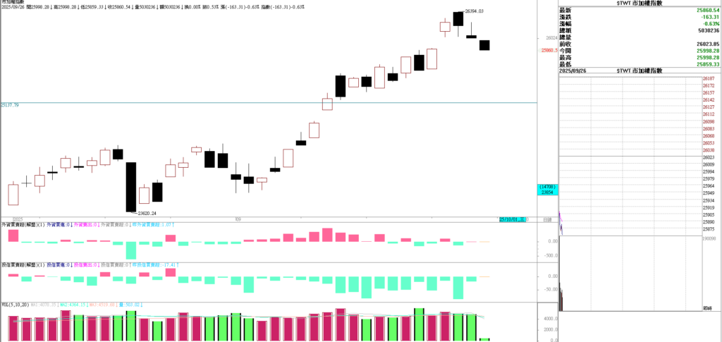 大家早安,台股前三天創新高,但是高檔出現一千多檔股票下跌,接著第二天台股開高走低,第三天開低走低,走勢出現往下跌。包括昨日下午過後台指期繼續下跌 跌 83點,算起來從高檔26537 跌到 26012 。跌很多,創新高後有拉回的疑慮。
