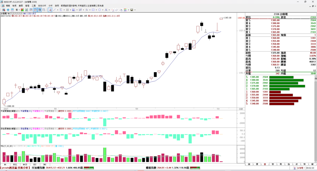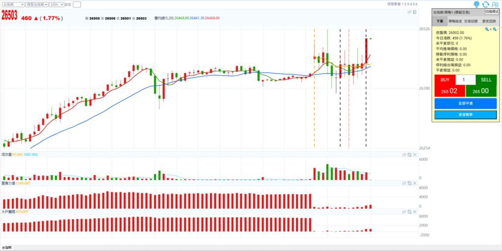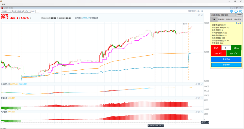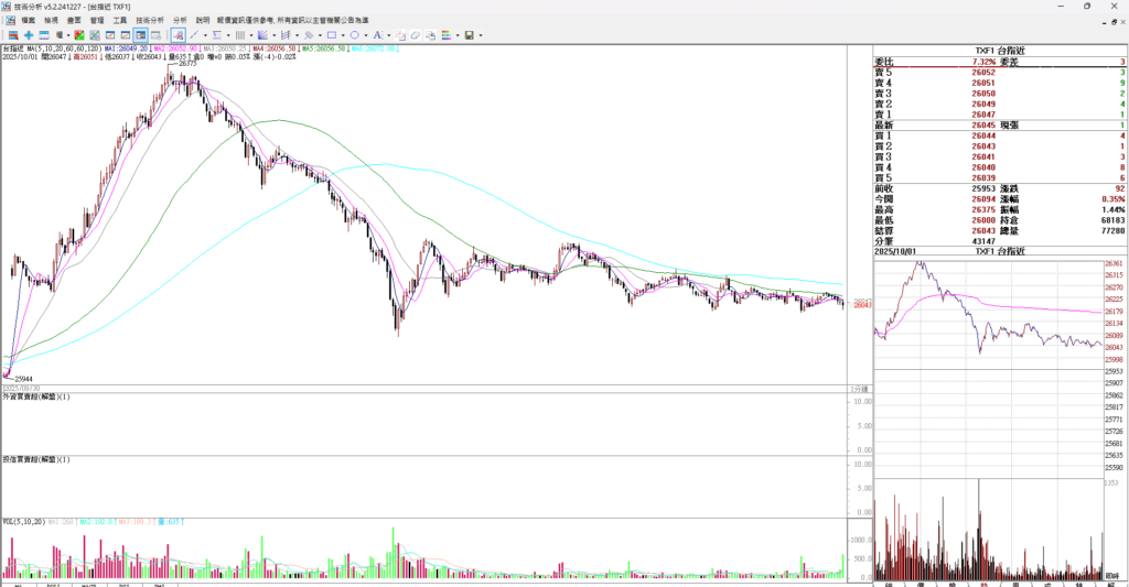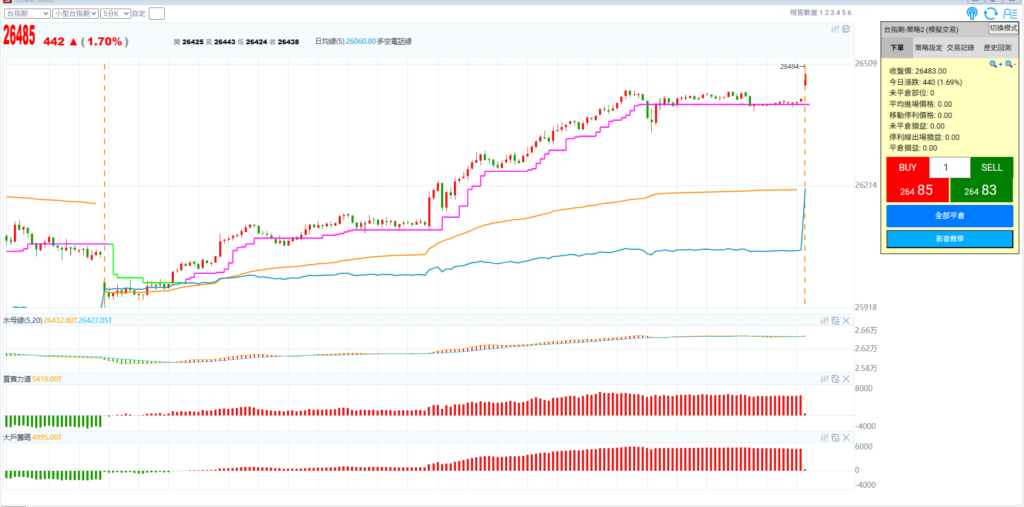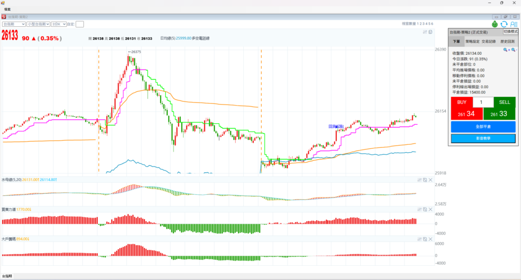看台指期三分K走勢搭配WINSMART多空電話線,你可以看到白天走勢紫色電話線往上 + 綠色電話線往下,到了夜盤又變成紫色電話線往上,這就是期貨目前的走勢,區間震盪盤整。