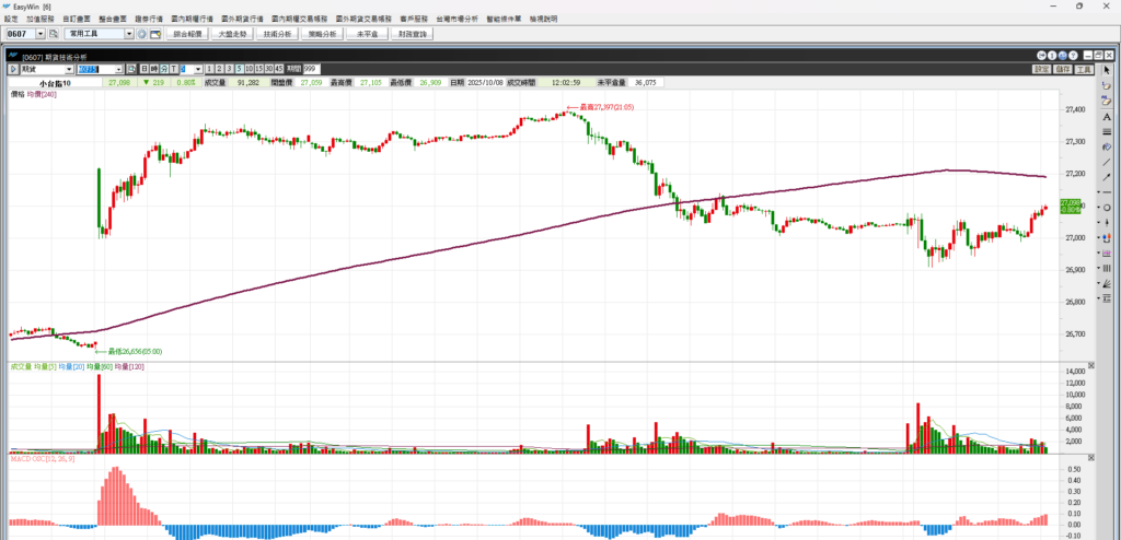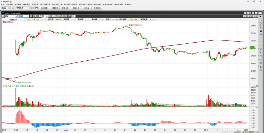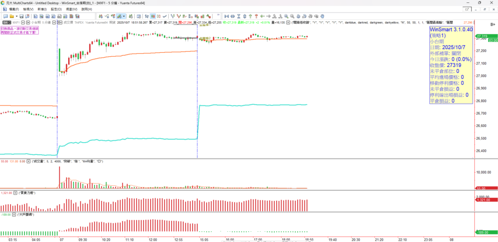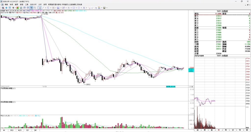 台指期五分K,昨天走勢都在主力成本線上方,偏多。看今天狀況如何。主力成本線之上偏多,之下偏空,今天晚上八點有教學