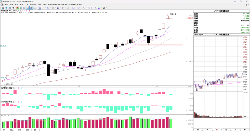 大家早安,台指期昨天盤中大跌三百點,最後開低走高跌幅剩下 240,大盤跌幅比較小,只有140點。跌幅不大。所以不用太緊張。創新高後隔天馬上拉回。台股多頭架構不變,昨天台積電拉回 20元,他一個人就貢獻下跌點數 160點,而台股也只下跌 140,所以昨天下跌的責任給台積電擔就好。