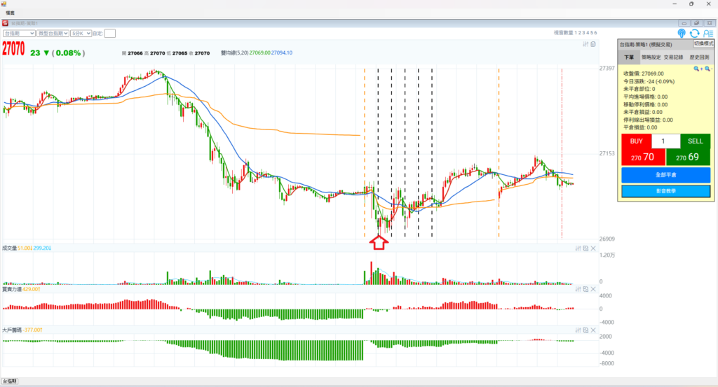 台指期五分K 昨天用時間轉折線抓到行情底部,就是第一個轉折位置 紅色箭頭的地方