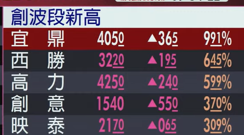 盤中創新高股票,宜鼎、西勝、高力、創意、映泰、景碩