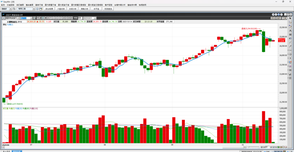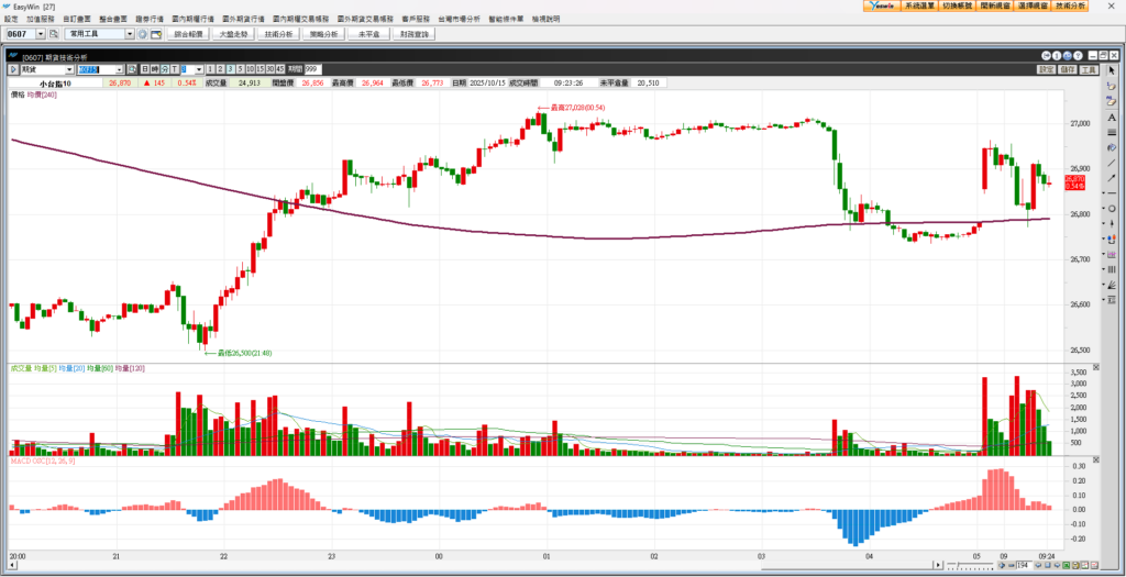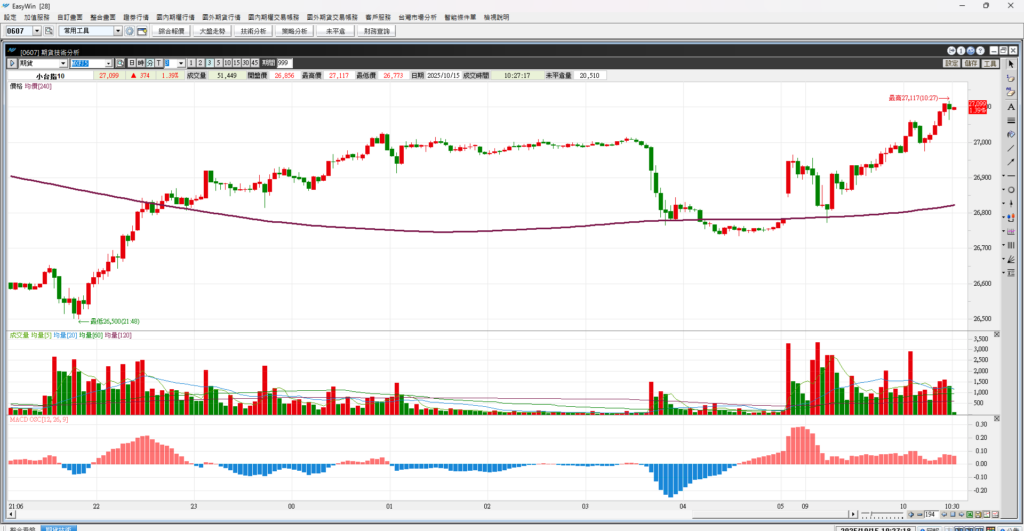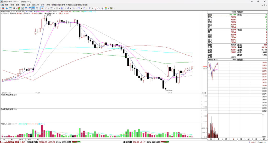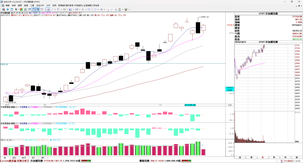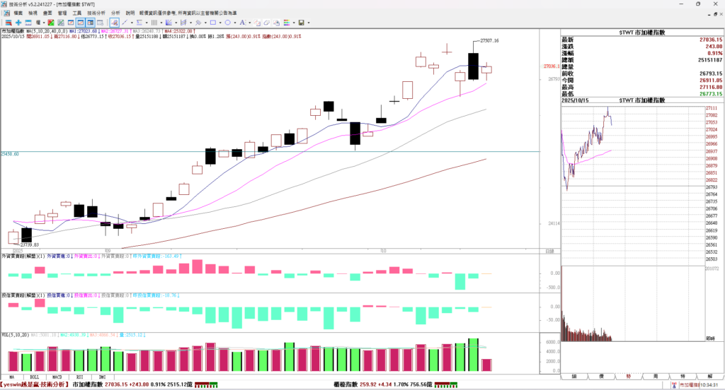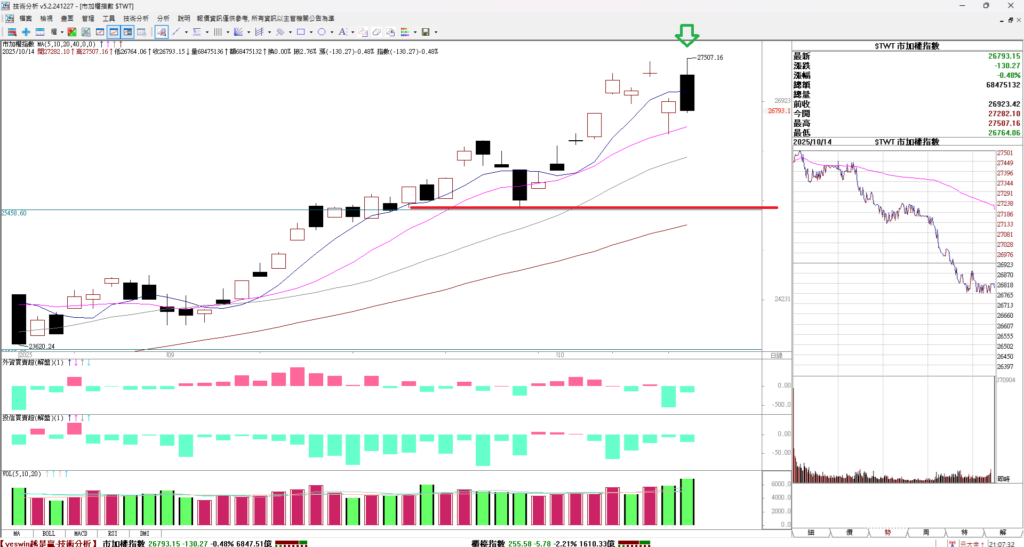大家早安,前天台股開低走高,昨天台股開高走低,走勢兩樣情。以最新的走勢來看並不好。因為昨天創新高到27507 但是最後收盤在26793 ,跌 714點,這不是好事情,表示有聰明資金逢高逃跑。這也可能是股市漲太多,主力大戶盤先逢高出脫,昨天才追進的投資人要賠錢了。昨日高檔爆量長黑不是好的K棒。請大家小心。