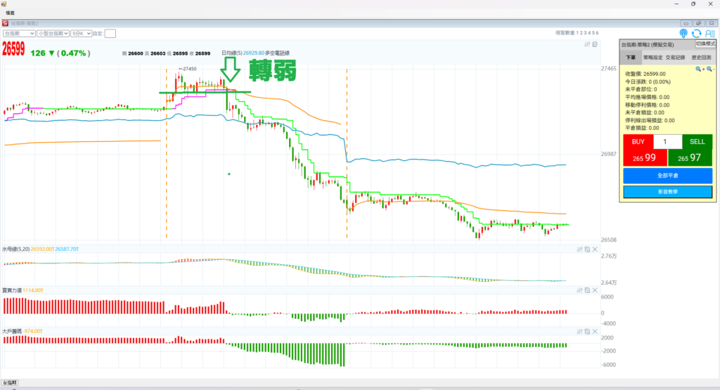 看台指期五分K + 多空電話線,可以看到昨天開高以後沒多久轉弱,然後電話線一路綠色往下,如下圖。