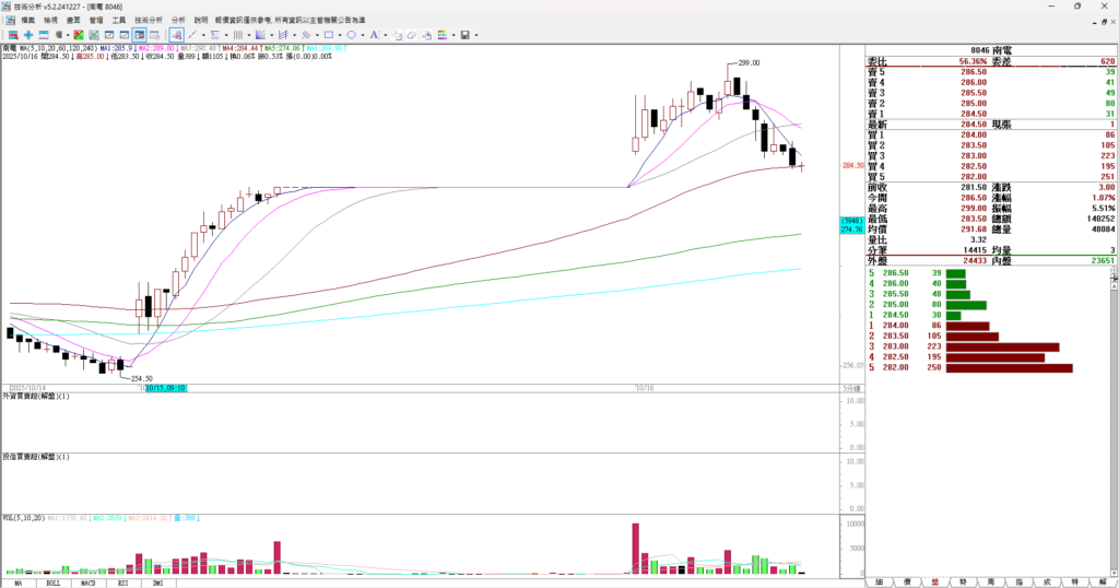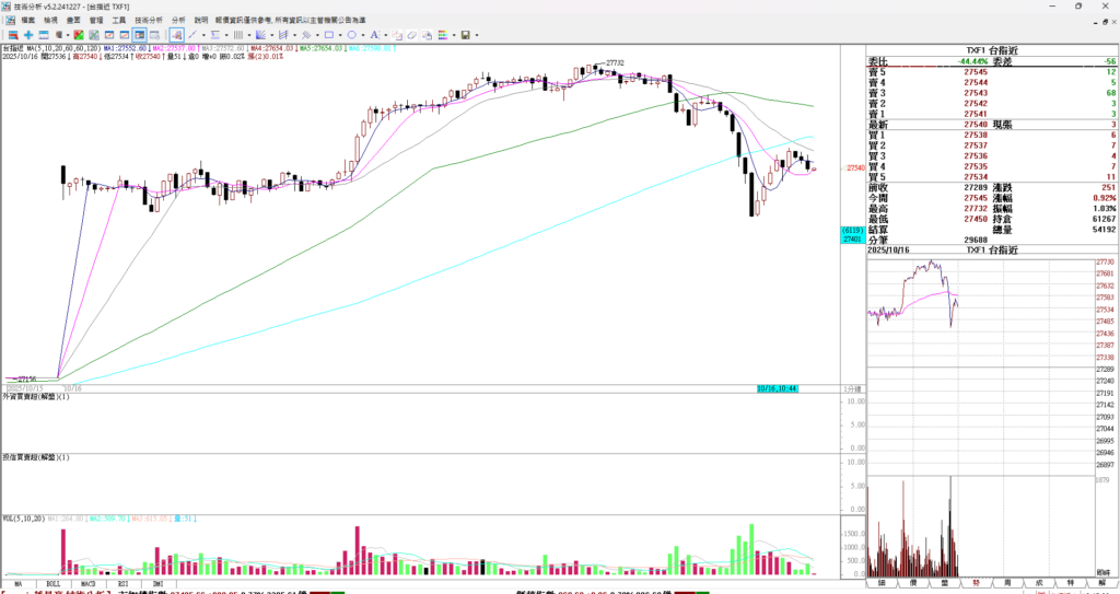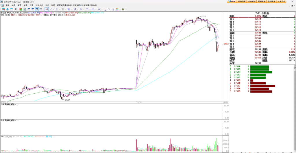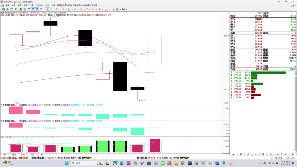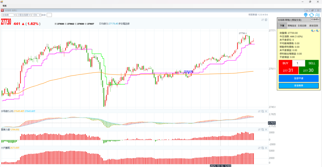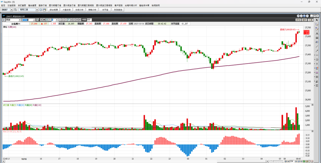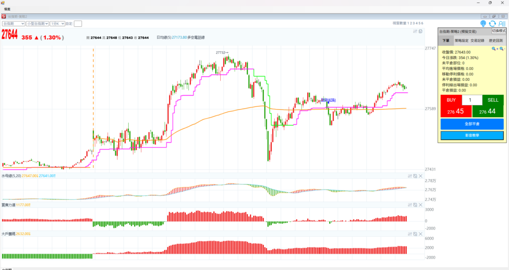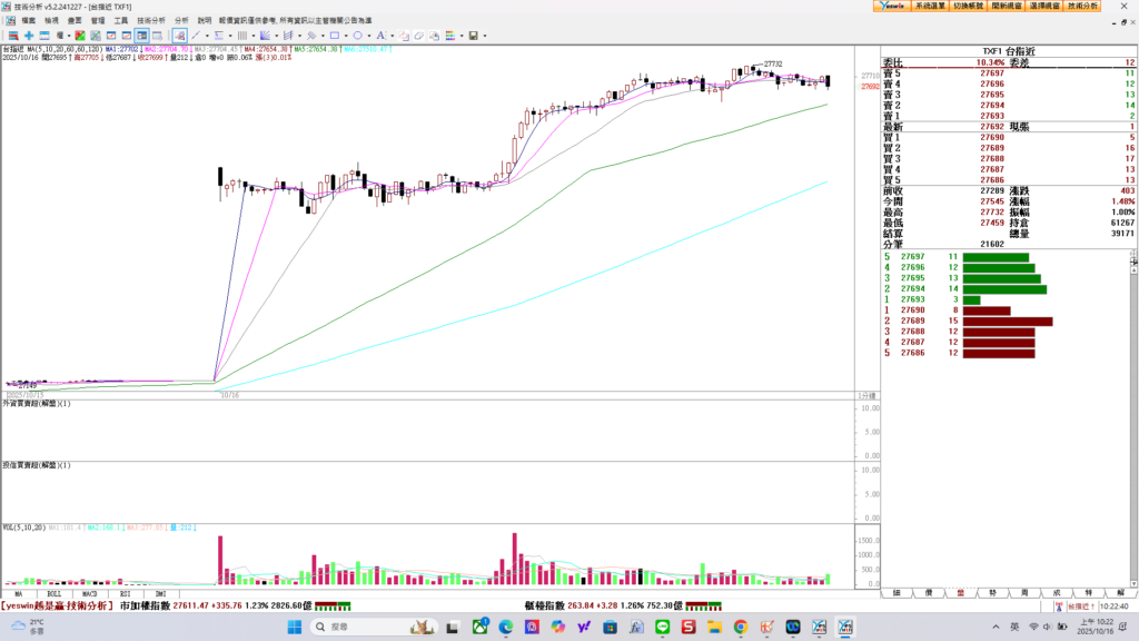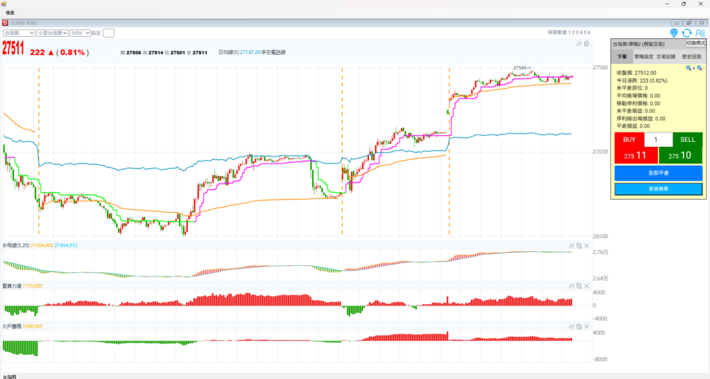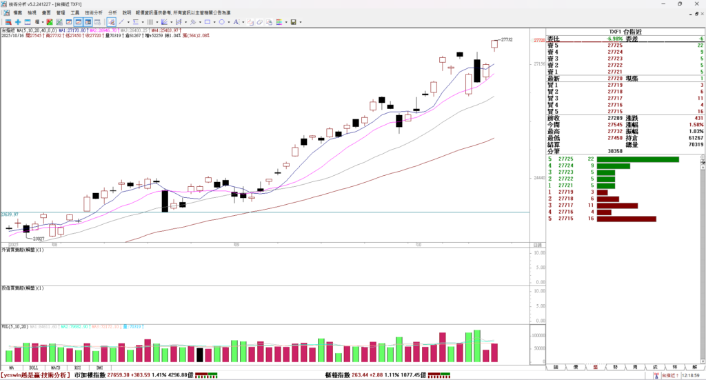 看台指期五分K,昨天大漲431點,晚上又大漲 222點,走勢強勁,就快創新高。WINSMART的多空電話線也呈現紫色向上爬樓梯,走勢正在多方。