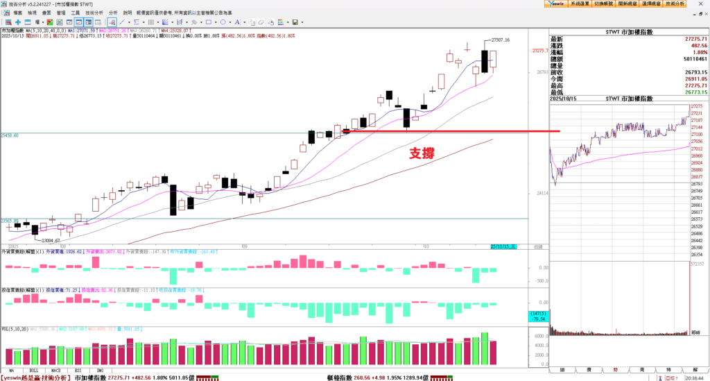 大家早安,昨天台股上漲 482 點,將近五百點的漲幅,前天台股才開高走低溜滑梯跌 700點,隔天就上漲500點,幾乎化解了前一天的跌勢,也化解了雙十連假的期貨跌勢。台股超強,不怕跌。目前台股指數在 27275 ,台積電就要法說會,台積電率先創新高到 1465元,台積電相關概念股也大漲,例如亞翔也在昨天漲停。台積電的財報應該是好的,因為AI正熱,台積電是AI基礎設施的核心。