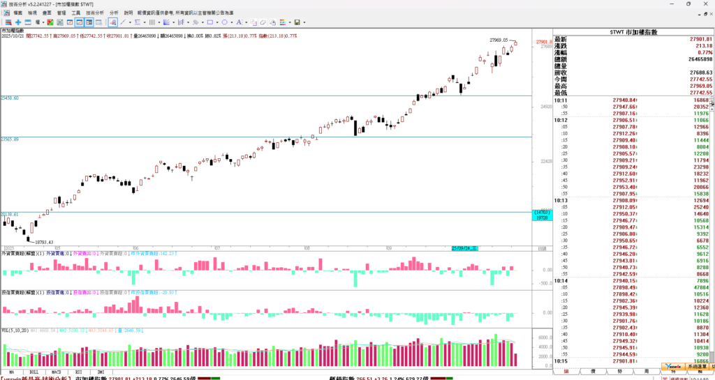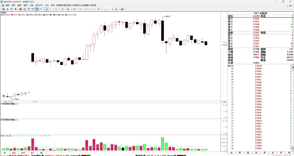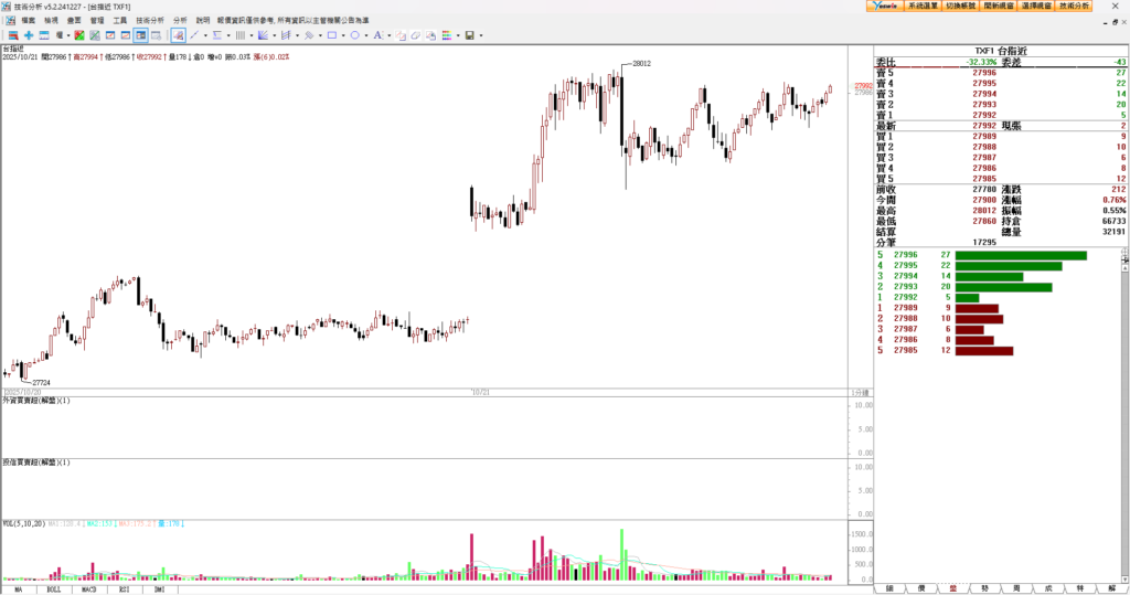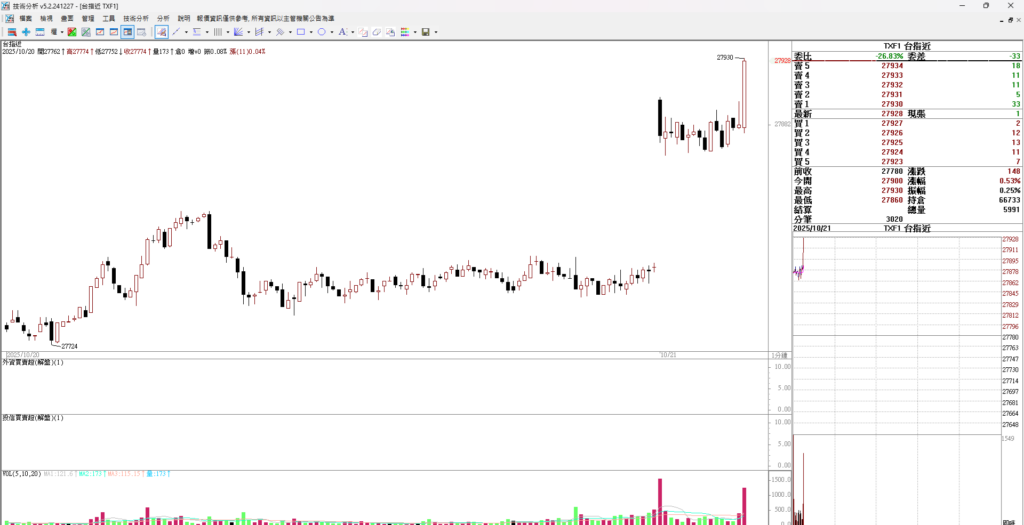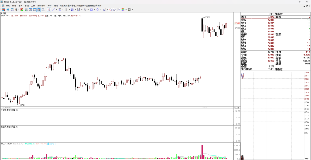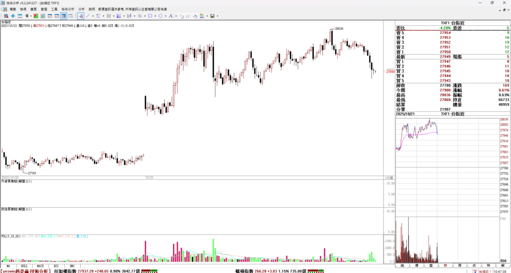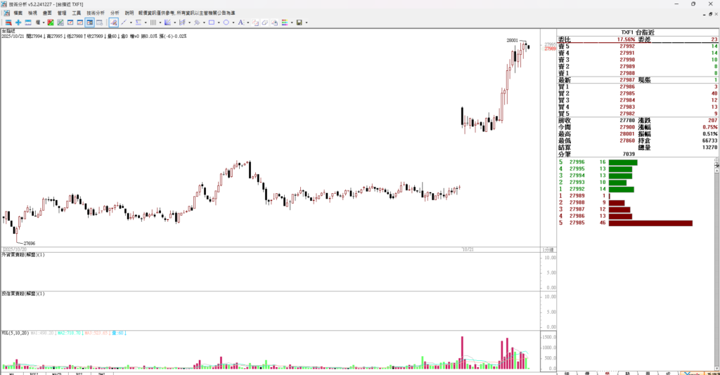 看台指期一分K,早盤有一段拉回測開盤價,但是重新漲上去之後 就一路向上,這一段是鴻海、廣達、緯創、台積電等權值股同步拉抬。最後上漲 455點 漲幅相當大,一天就可以上漲四百多點。其實在昨天的交易日記就有解盤,前天夜盤拉回的平台突破以後有機會轉強,在下圖紅色圈圈處,從轉強到今日也上漲了 640多點的幅度,所以趨勢往上,短線找買點機率比較高,也賺得多。