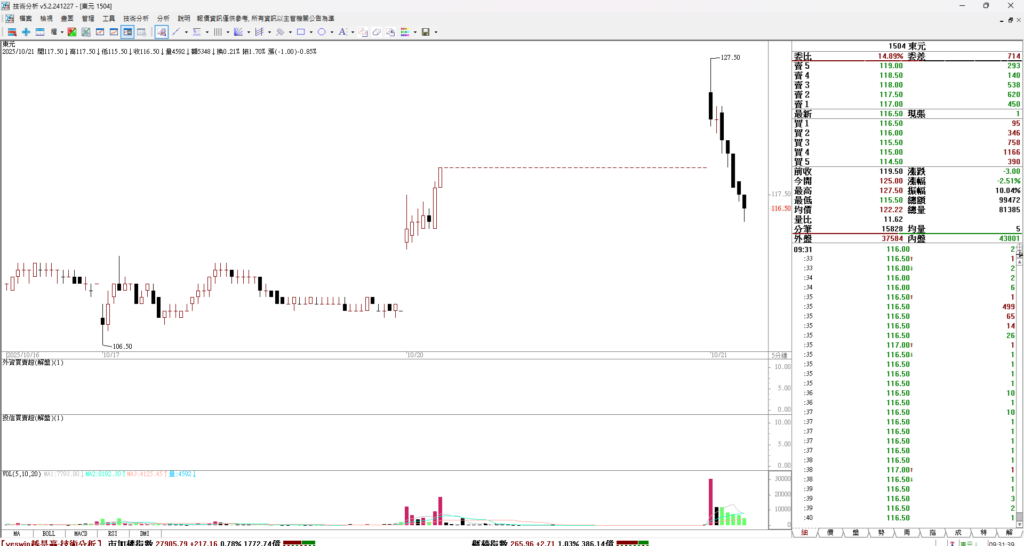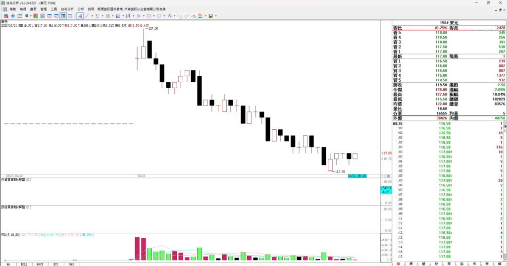 東元一分K 開盤最大量,跌破後走弱,破昨收,也是走弱