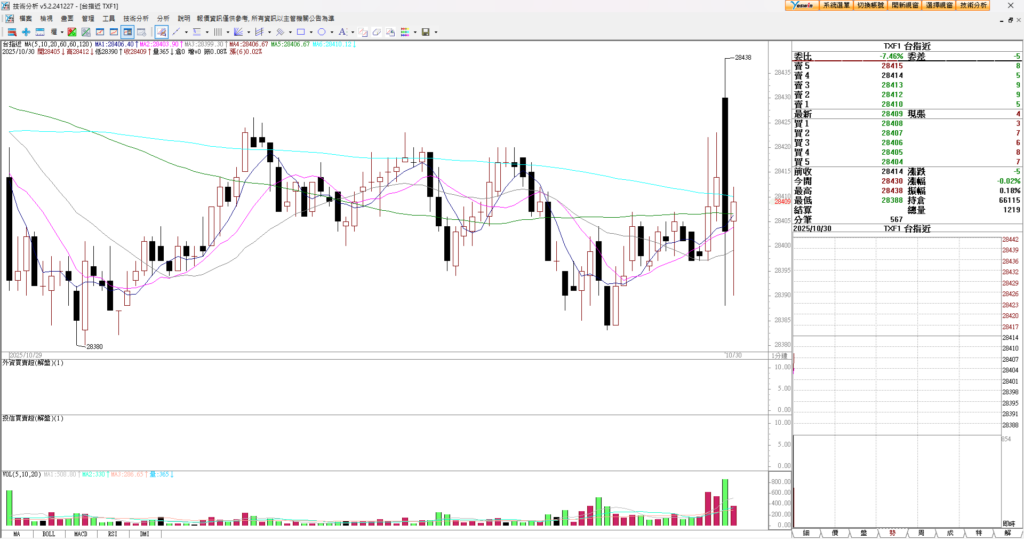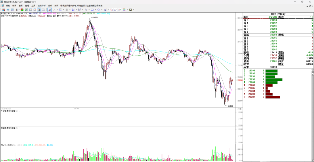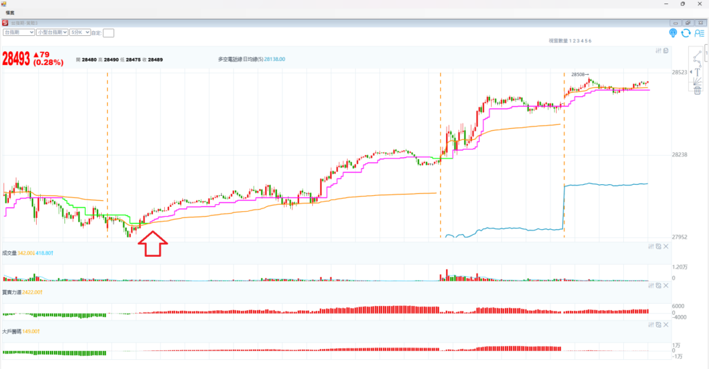 看台指期五分K + 多空電話線,最好的進場點是由空轉多的點,例如綠色電話線往上轉成紫色電話線往上的點,這表示拉回買進。