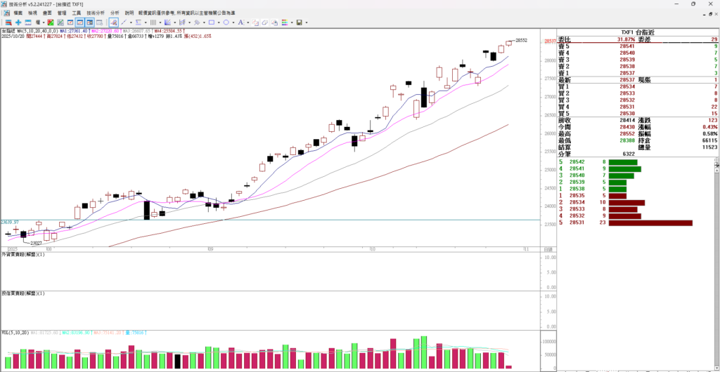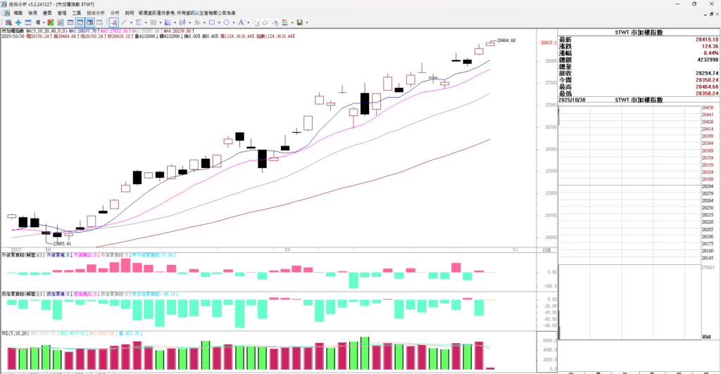 目前市場上主流還是AI,輝達領頭、台積電代工、台灣產業鏈受益。晶片、封裝、散熱、電源、記憶體、被動元件、組裝 等等的族群都輪流上漲,這是目前台股上漲的主旋律。