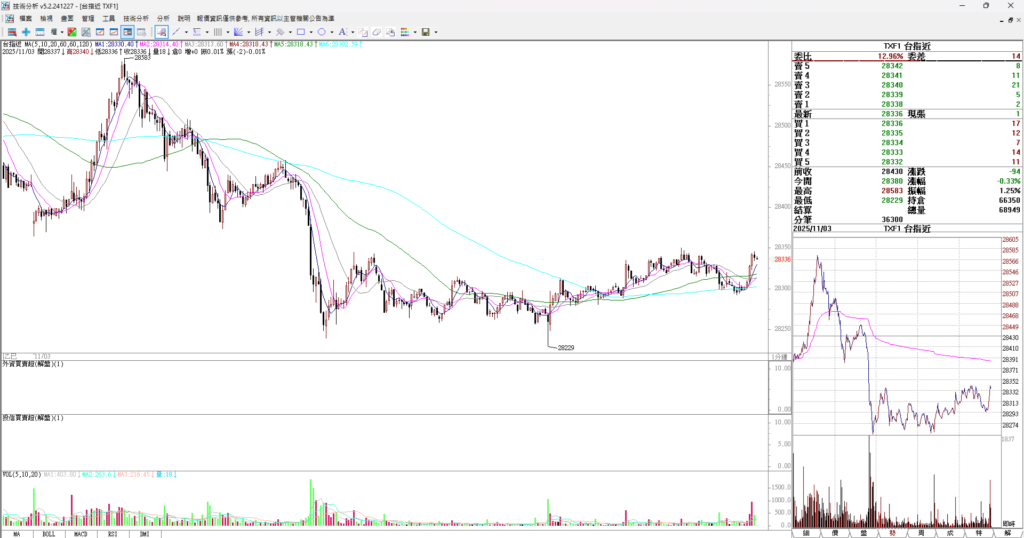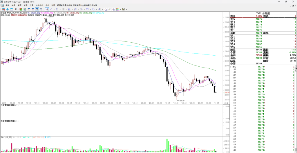 看台指期五分K,週五震盪上漲,但週五晚上就直落下跌,終場下跌 168點,走勢走弱。