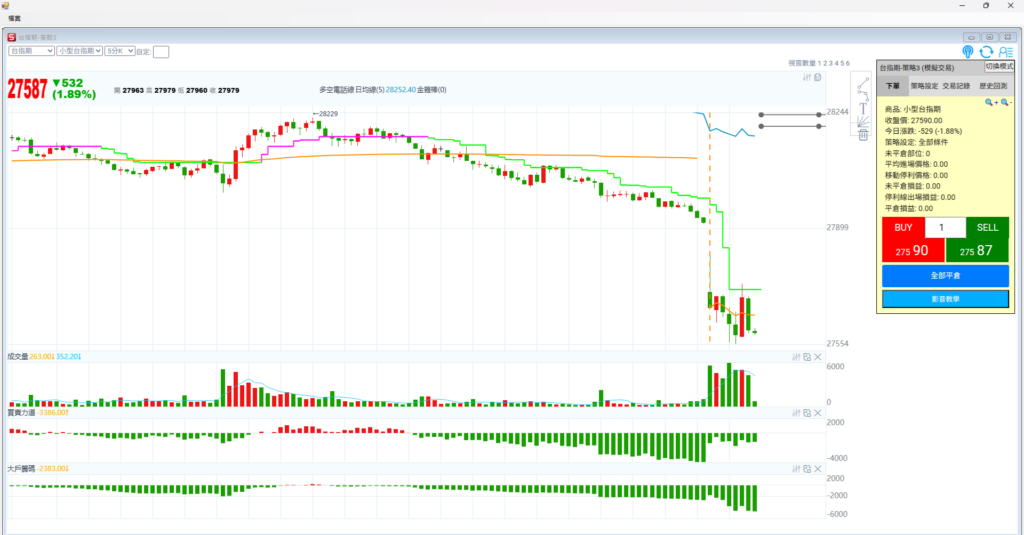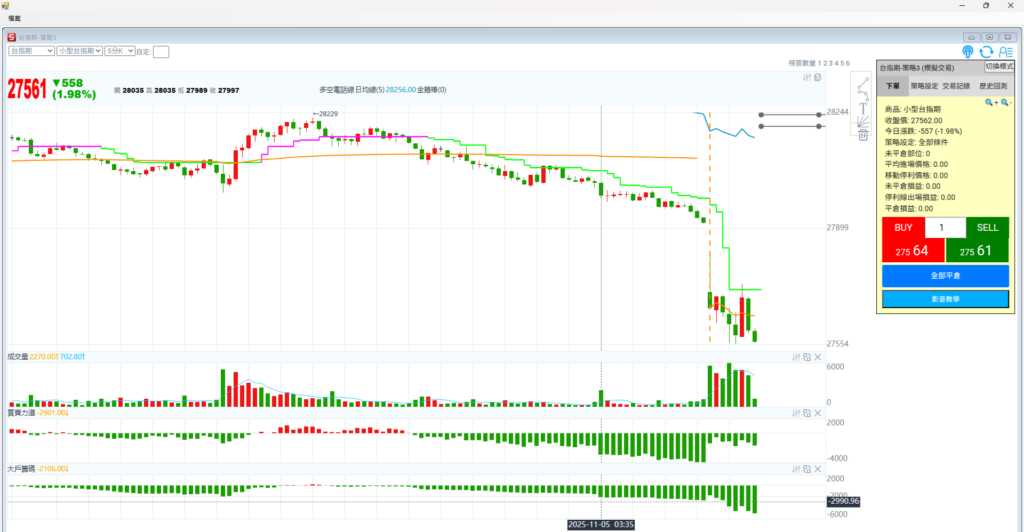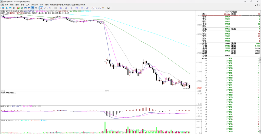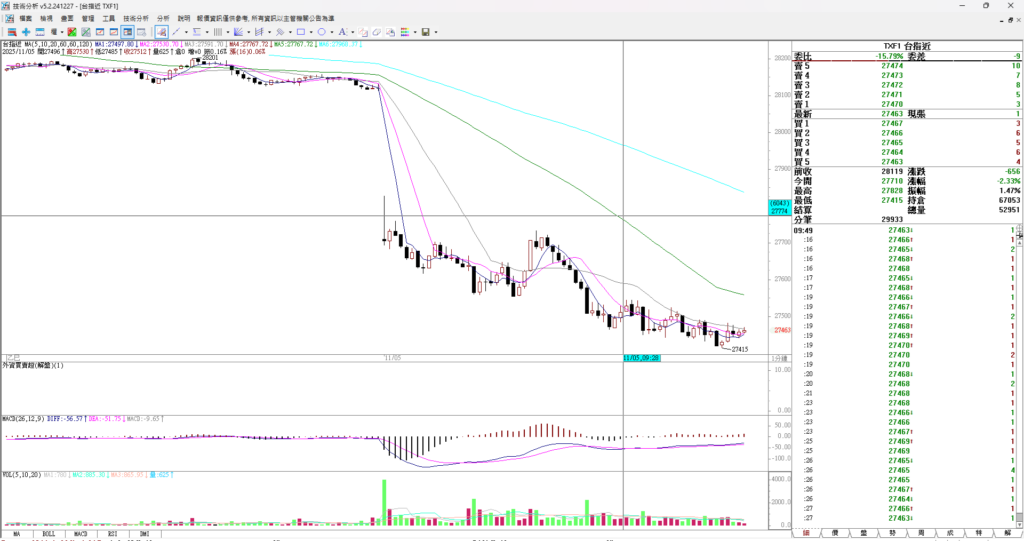 台指期有些多方抵抗 ,台指期五分K,但是籌碼都是空方數據 是空方控盤